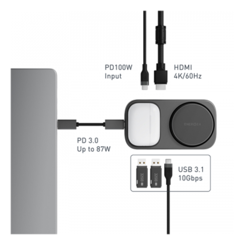 USB-хаб EnergEA WIDOCK PLUS сочетает док-станцию для смартфона, зарядку MagSafe и расширение портов для MacBook и ультрабуков. Алюминиевый корпус, Power Delivery до 87 Вт и поддержка 4K делают его универсальным решением.
