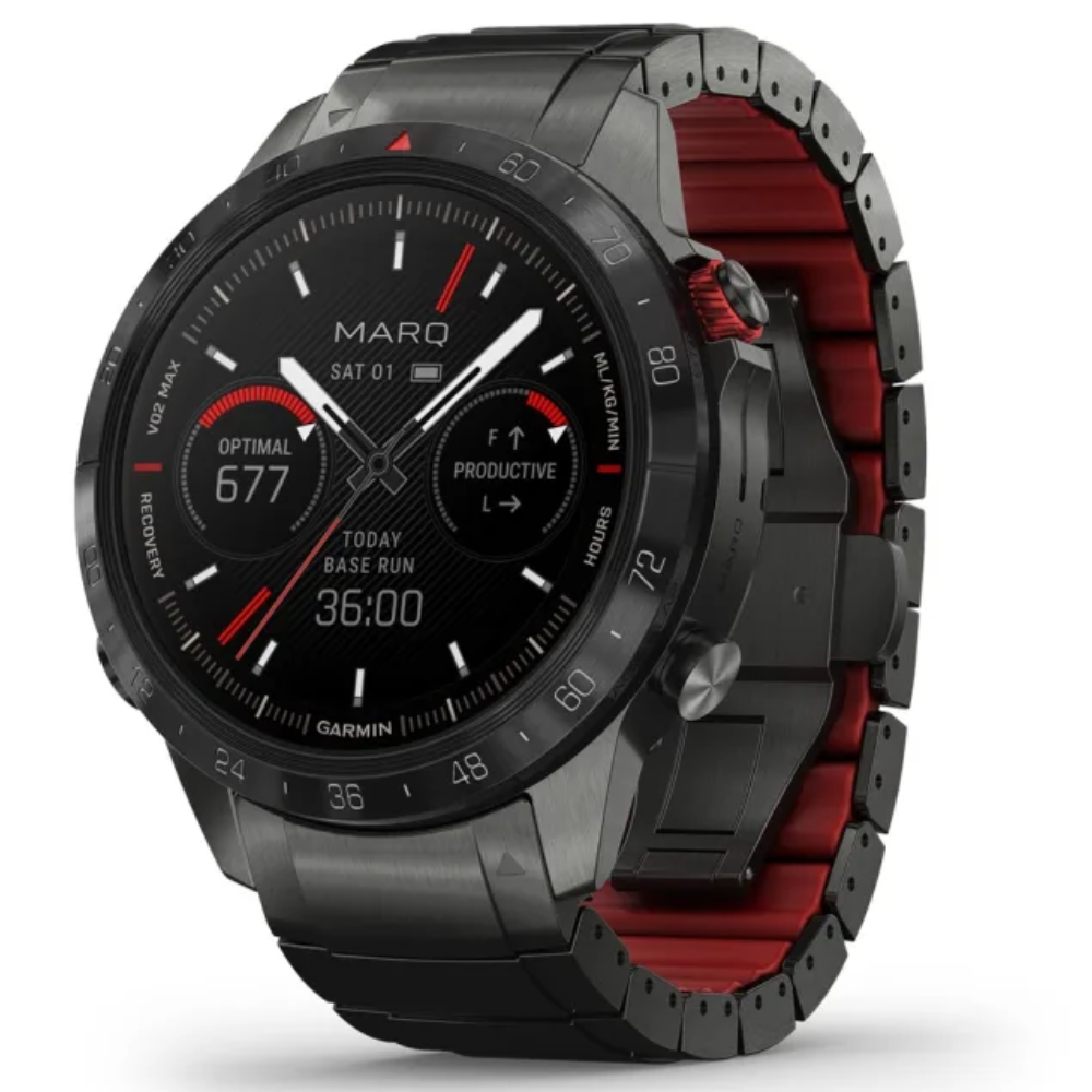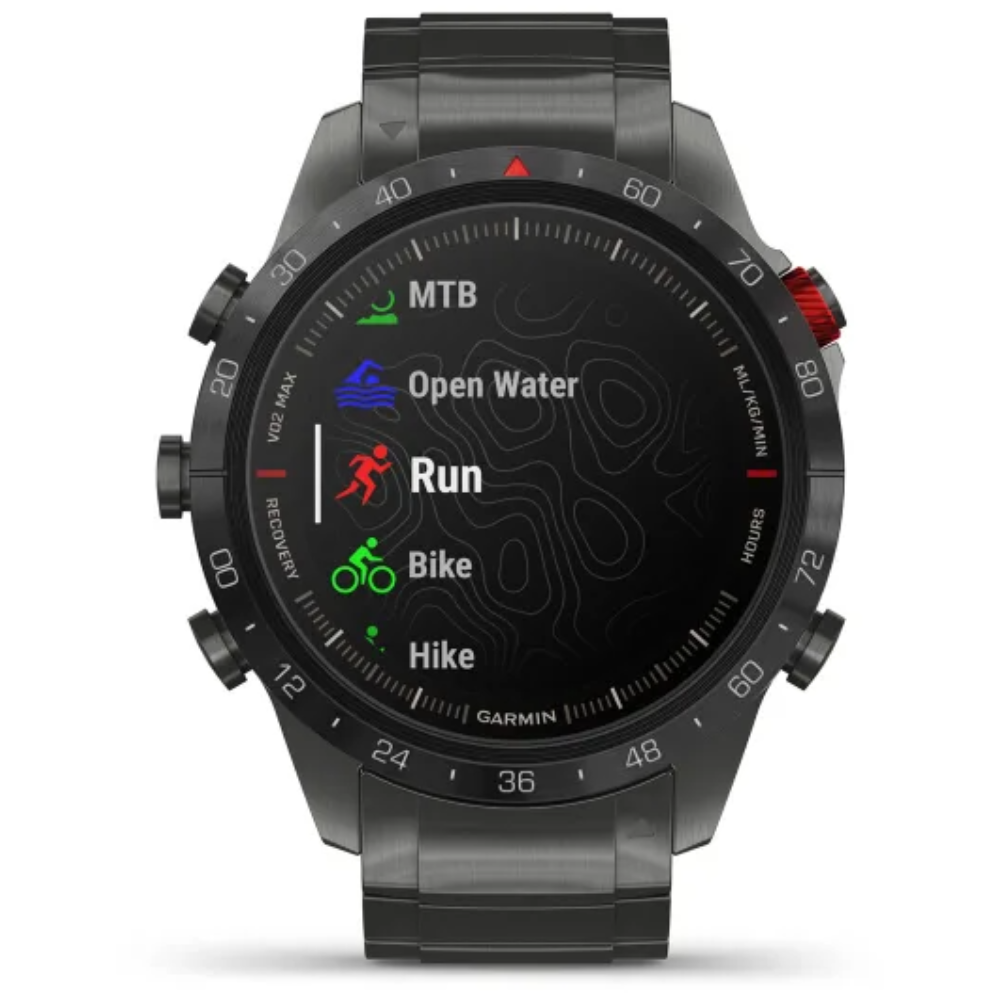 Особенности: два ремешка в комплекте (кожаный и силиконовый), размер корпуса 46 мм, сапфировое стекло, объем памяти 32 Гб, автономность в режиме смарт-часов до 16 дней, пульсоксиметр SpO₂, интерфейсы Bluetooth, ANT+, Wi-Fi