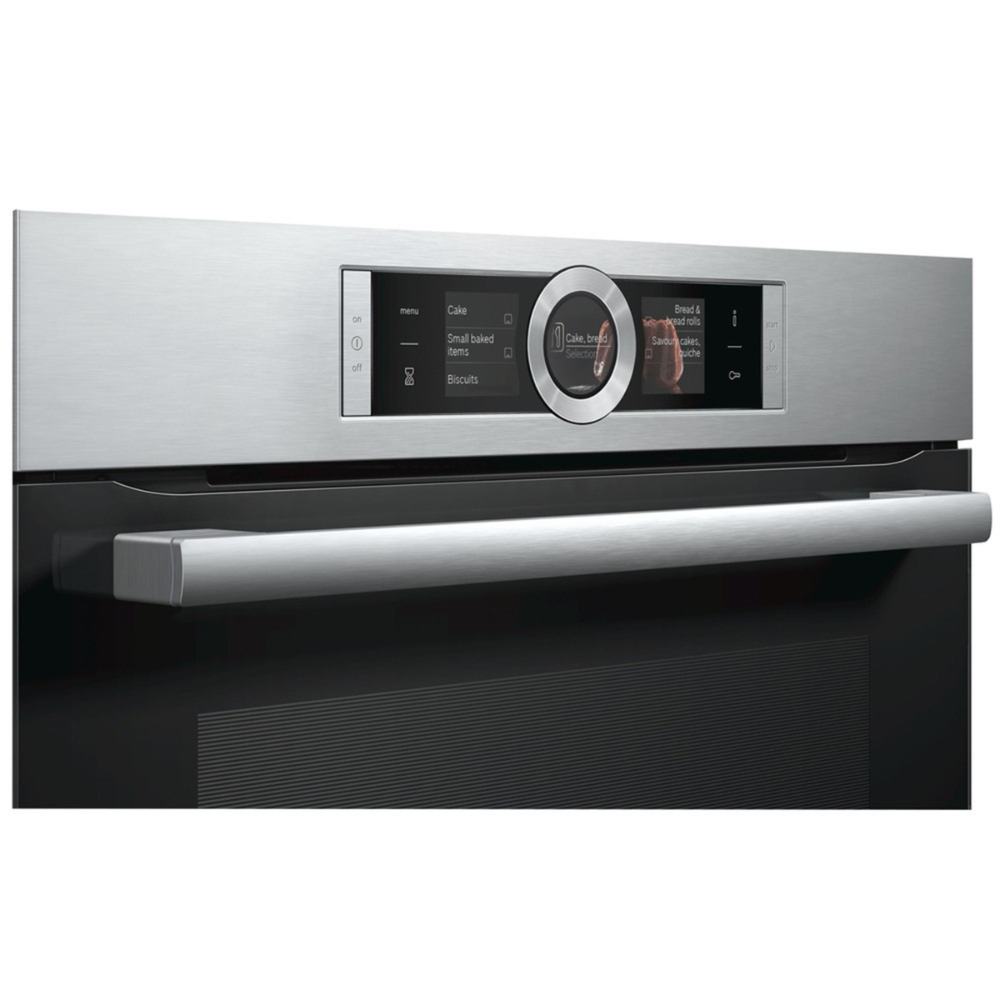 Bosch HBG636ES1 выполнен в оттенке нержавеющей стали и выглядит сдержанно, современно и универсально. Такой духовой шкаф легко вписывается как в минималистичные, так и в технологичные кухни. Управление построено на сочетании сенсорных кнопок и фирменного поворотного переключателя Control Ring — все действия выполняются точно и без лишних движений. Цветной TFT-дисплей диагональю 2.5″ наглядно отображает выбранные режимы, температуру и время, а многофункциональные часы Easy Clock помогают контролировать процесс приготовления.