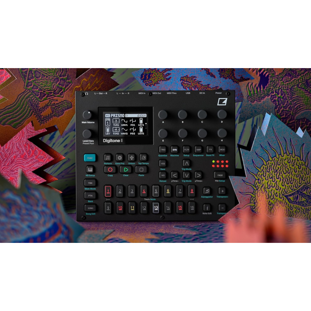 Elektron Digitone II — это мощный цифровой синтезатор с 16-голосной полифонией и 16 треками, каждый из которых может работать как синтезаторный трек или как полноценный MIDI-трек. Инструмент идеально подходит для студийной работы, лайв-выступлений и построения автономных сетапов.
