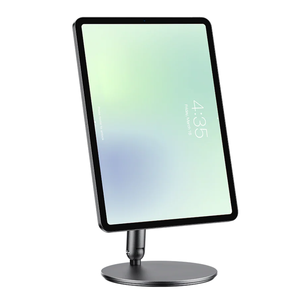 Основание поддерживает вращение на 360 градусов, что делает подставку удобной для презентаций, видеозвонков и совместной работы. Экран можно легко повернуть к собеседнику или изменить ориентацию за считанные секунды.