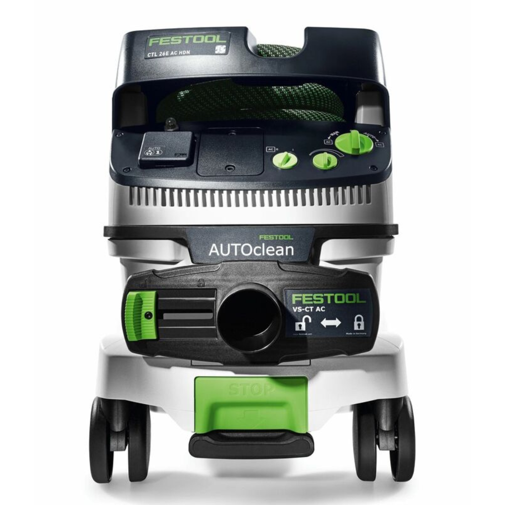 Система пылеудаления с автоматической очисткой фильтра обеспечивает стабильную производительность при работе с минеральной и строительной пылью, сохраняя высокую силу всасывания даже при длительных нагрузках. Модель оборудована усовершенствованным механизмом AUTOCLEAN, который регулярно встряхивает основной фильтр и предотвращает снижение расхода воздуха. Интервалы очистки могут быть настроены через приложение Festool, что позволяет адаптировать работу под интенсивность пыли и поддерживать эффективность без ручного вмешательства. Сенсорная панель управления обеспечивает быстрый доступ к регулировке мощности, изменению рабочих параметров и активации вспомогательных функций.