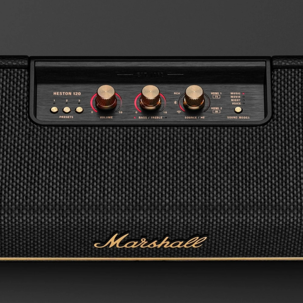 Marshall Heston 120 — саундбар для тех, кто хочет превратить домашний просмотр фильмов и сериалов в полноценный кинотеатр. С поддержкой Dolby Atmos и DTS:X устройство создаёт объёмный, многослойный звук, передающий каждый эффект и музыкальную деталь с высокой точностью. Фирменный стиль Marshall с фактурной отделкой под кожу и культовой «salt & pepper» решёткой добавляет премиальности и станет выразительным акцентом в интерьере.