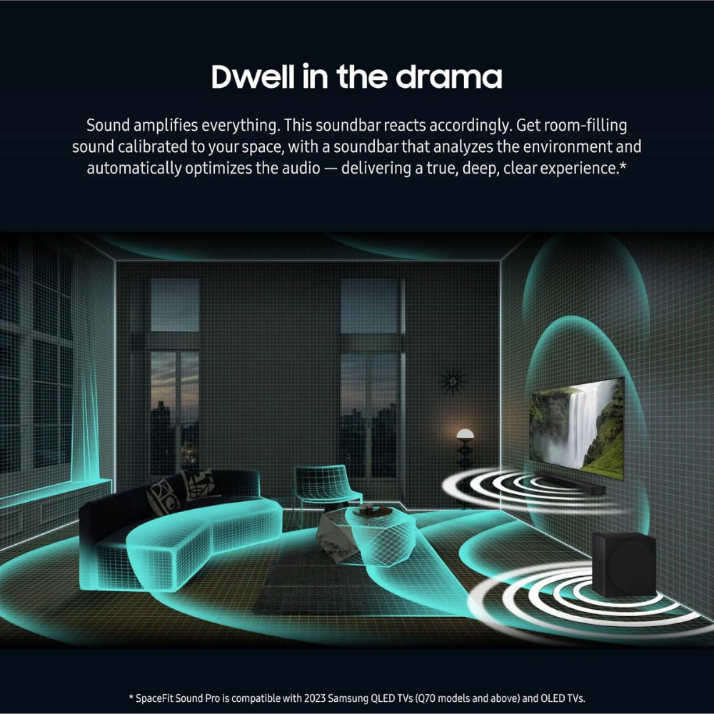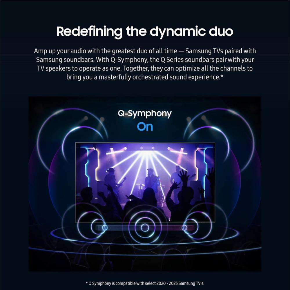 Саундбар Samsung HW-Q800C обеспечивает мощный звук с поддержкой Dolby Atmos и DTS:X. Имеет беспроводной сабвуфер и совместимость с Q-Symphony для синхронизации с телевизорами Samsung.