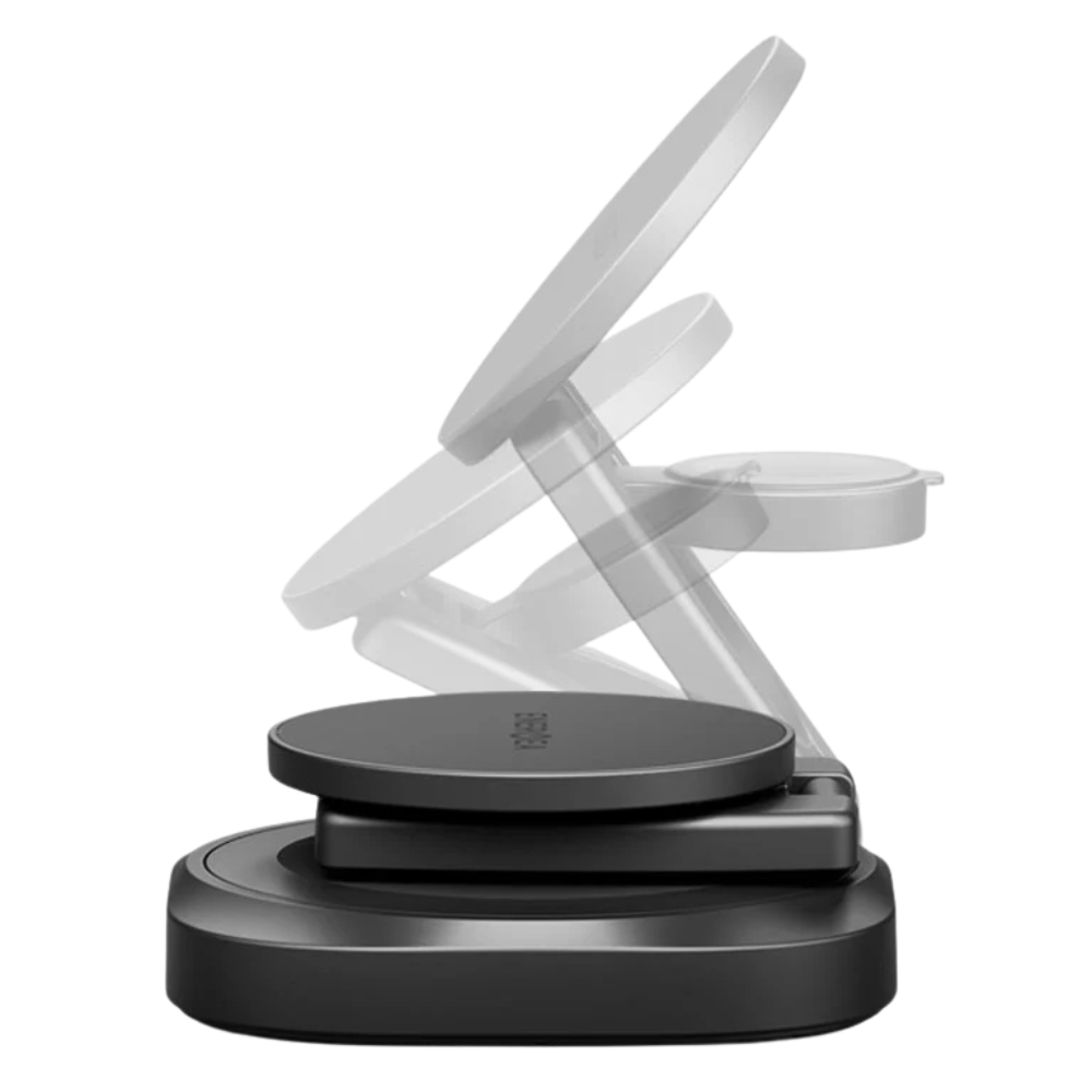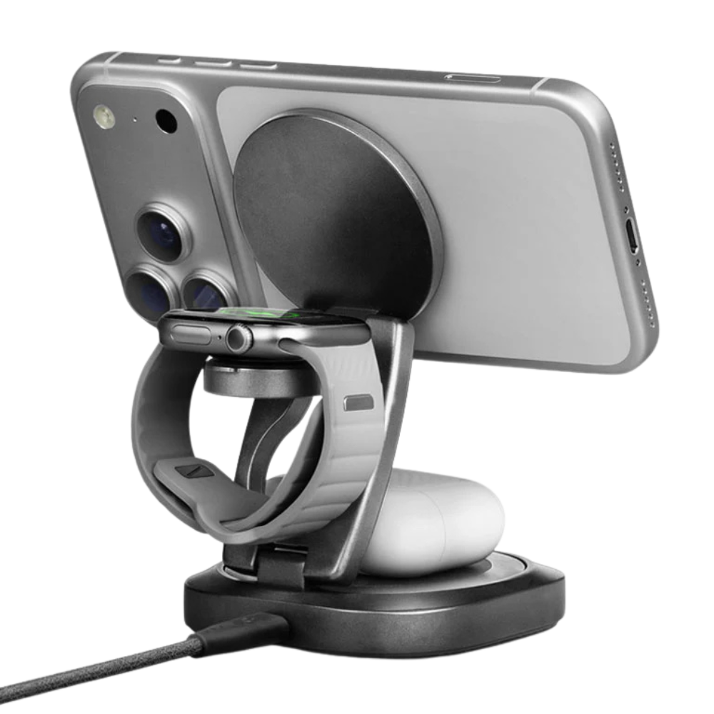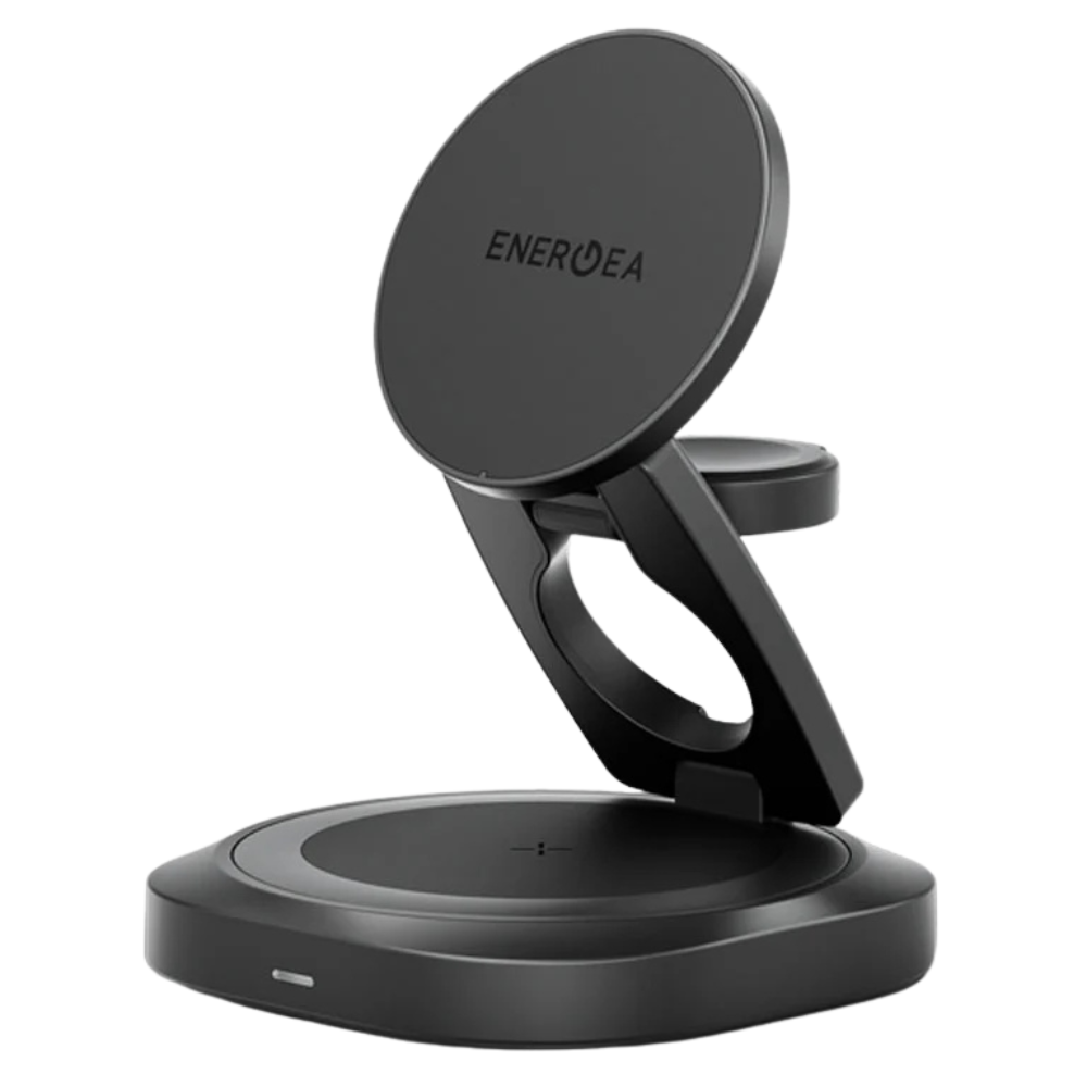 Складывающаяся беспроводная зарядка 3-в-1 Energea AluMag Gyro 25W в цвете Gunmetal — элегантное и компактное решение для одновременной зарядки смартфона, наушников и смарт-часов.