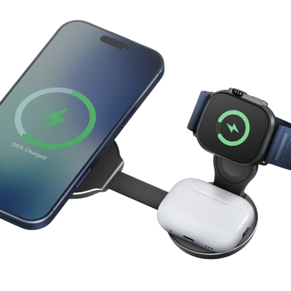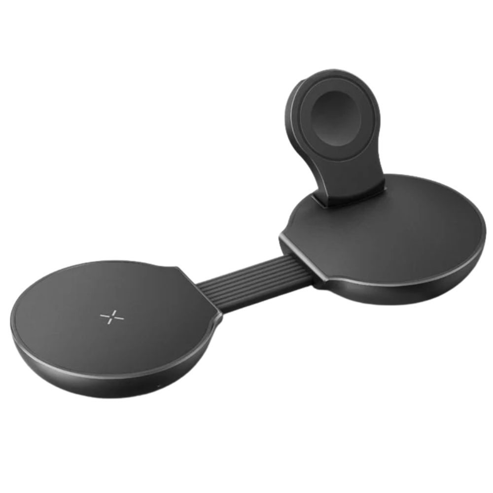 EnergEA AluMag Trio 2 — складная беспроводная зарядка 3-в-1 мощностью до 25 Вт. Одновременно заряжает смартфон, Apple Watch и наушники, сохраняя компактность и премиальный дизайн в цвете Gunmetal.