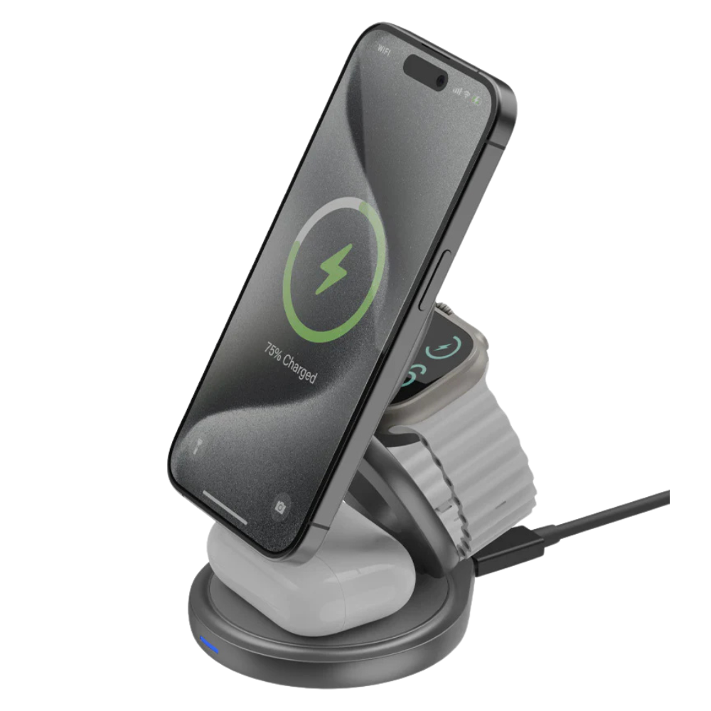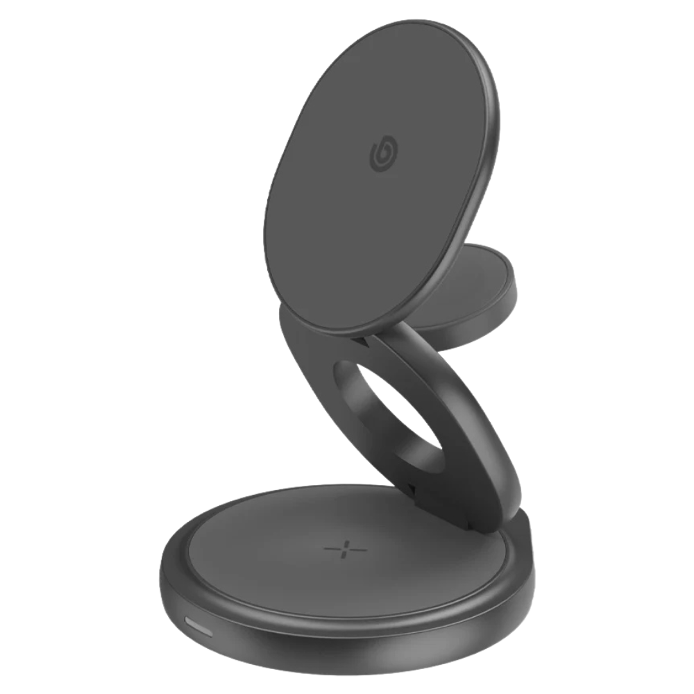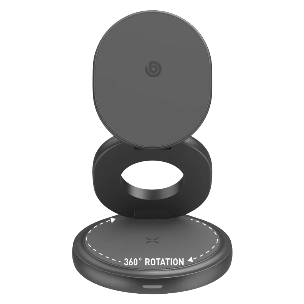 Bazic GoMag Gyre 15W – это универсальная складывающаяся беспроводная зарядная станция, разработанная для удобной и быстрой зарядки сразу трех устройств. Поддержка MagSafe обеспечивает надежную фиксацию смартфона, а складной механизм делает зарядку идеальной для поездок и повседневного использования.