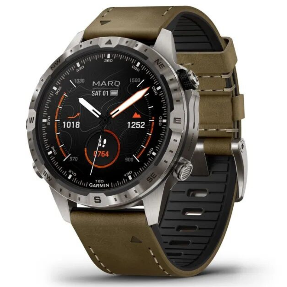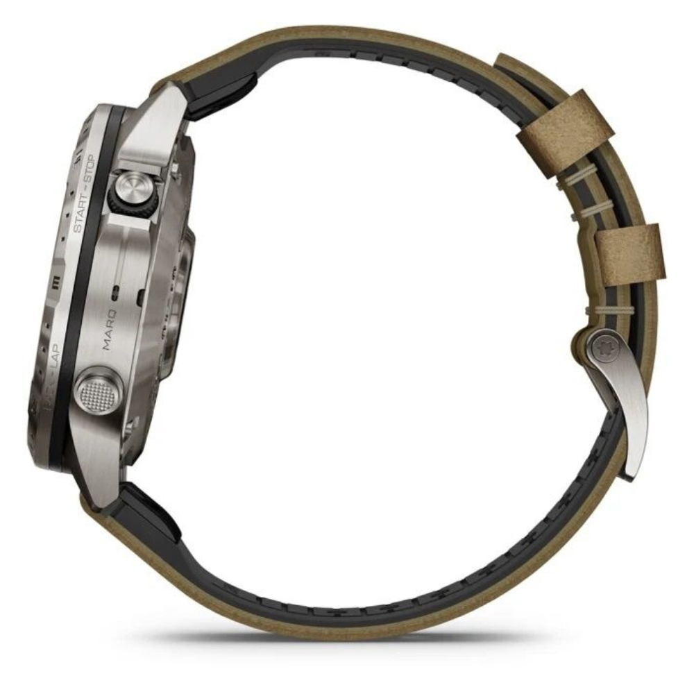MARQ Adventurer создан для тех, кто стремится исследовать новые горизонты и преодолевать любые препятствия. Эти часы-инструмент премиального класса помогают ориентироваться в дикой природе и путешествовать с максимальной точностью и безопасностью. Корпус 46 мм изготовлен из титана Класса 5 и защищен выпуклым сапфировым стеклом, а сенсорный AMOLED-дисплей обеспечивает четкое изображение и удобное управление. Гибридный ремешок из кожи и фторуглеродного каучука FKM сочетает стиль и комфорт. MARQ Adventurer оснащен многополосной навигационной системой GPS, Galileo и ГЛОНАСС с технологией SatIQ, датчиками ABC, альтиметром, барометром и компасом. Функция ClimbPro позволяет отслеживать актуальные подъемы, а путеводитель NextFork с предзагруженными картами TopoActive Europe помогает планировать маршруты. Устройство ведет мониторинг уровня кислорода в крови, пульса, дыхания, сна, энергии Body Battery™ и стресса, предлагает анимированные тренировки, адаптивные планы Garmin Coach, измеряет VO2 max, выносливость и готовность к тренировкам. Для любителей спорта доступны профили для бега, плавания, велоспорта, туризма, гребли, лыжного спорта, гольфа, серфинга и многих других дисциплин. Устройство поддерживает пошаговую навигацию, расчет круговых маршрутов, горнолыжные карты, карты полей для гольфа и ориентирование с 360-градусным кольцом компаса. Также часы обеспечивают уведомления со смартфона, бесконтактные платежи Garmin Pay™, управление музыкой, загрузку приложений и виджетов через Connect IQ™, функции безопасности и слежения, включая передачу координат при чрезвычайных ситуациях, а приложение «Экспедиция» позволяет продлить автономность путешествий. Аккумулятор обеспечивает до 16 дней работы в режиме смарт-часов и до 75 часов при использовании GPS.