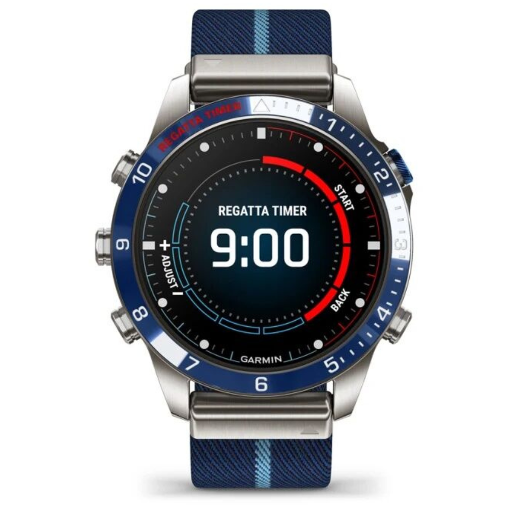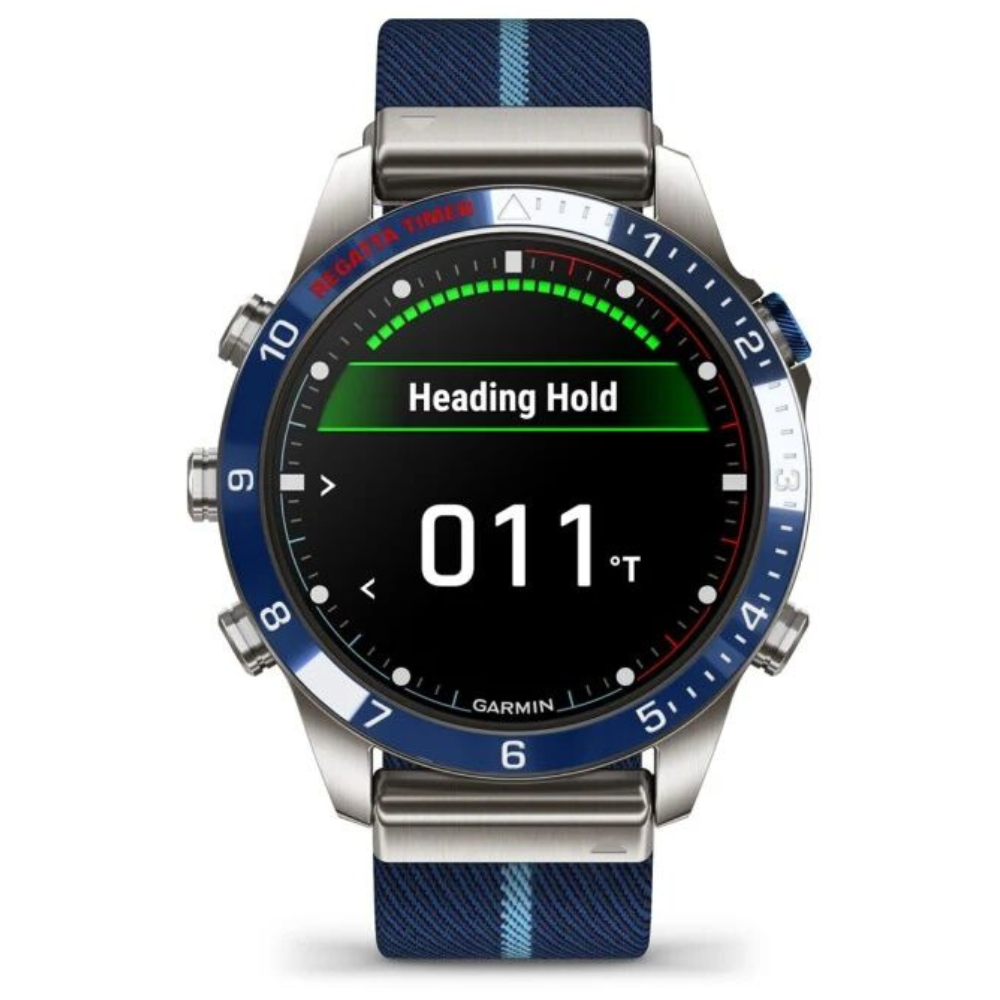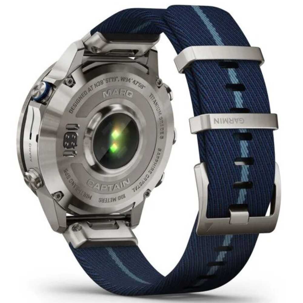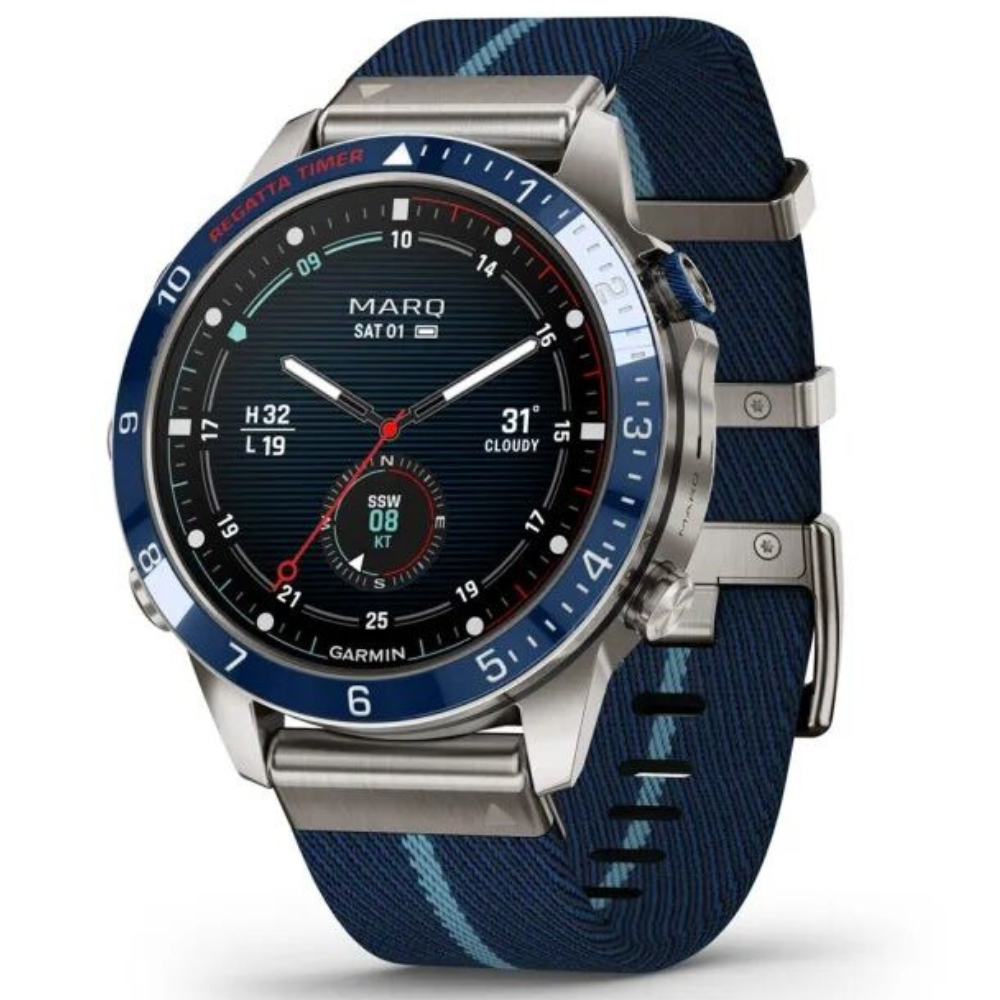 MARQ Captain (Gen 2) создан для тех, кто выбирает море и ценит точность во всём. Корпус из титана Grade 5 диаметром 46 мм и сапфировое стекло делают модель прочной и износостойкой, а яркий AMOLED-дисплей с сенсорным управлением обеспечивает кристально чёткое изображение. Полосатый ремешок, выполненный в технике французского жаккардового плетения, подчёркивает изысканный морской характер часов. MARQ Captain объединяет в себе инструменты для регаты, управления судном и безопасности на воде, предлагая капитану полный контроль в любых условиях.